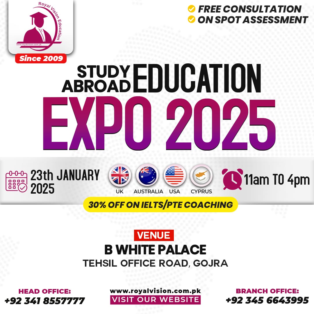 Are you ready to take the first step toward your dream of studying abroad? The Study Abroad Expo 2025 is coming to B White Palace, Tehsil Office Road, Gojra, on 23rd January 2025. This event is a golden opportunity for students and professionals to explore educational opportunities in leading countries like the UK, USA, Australia, and Cyprus.